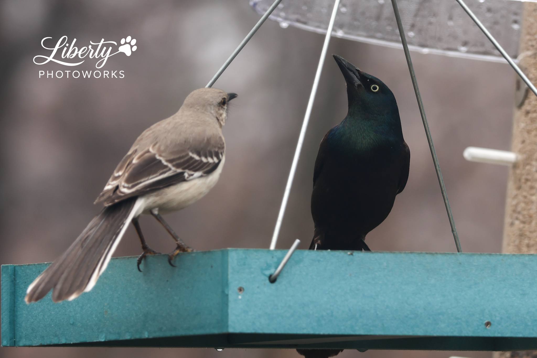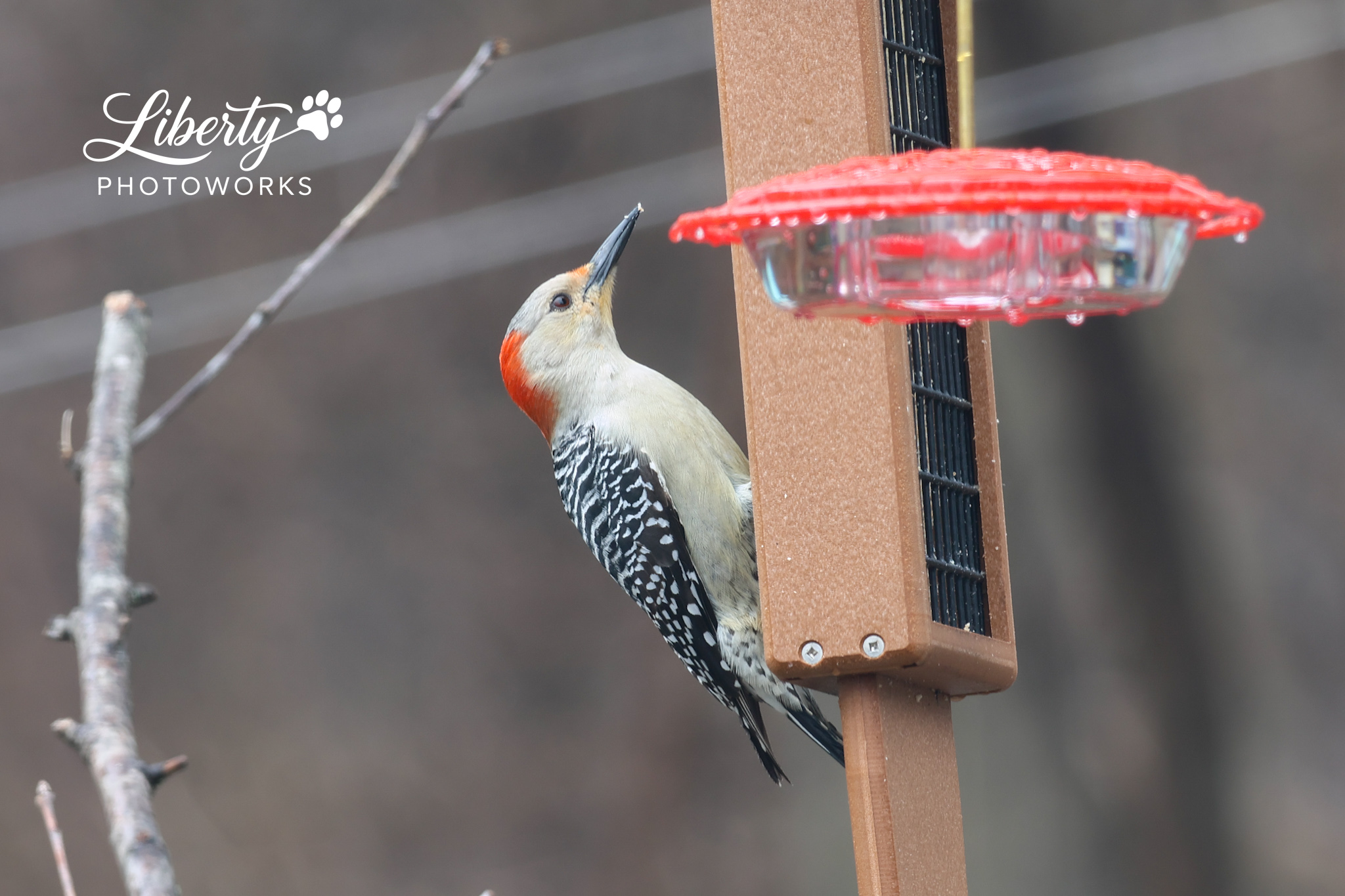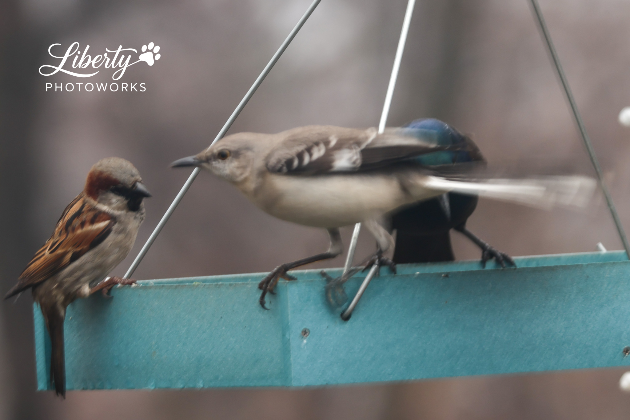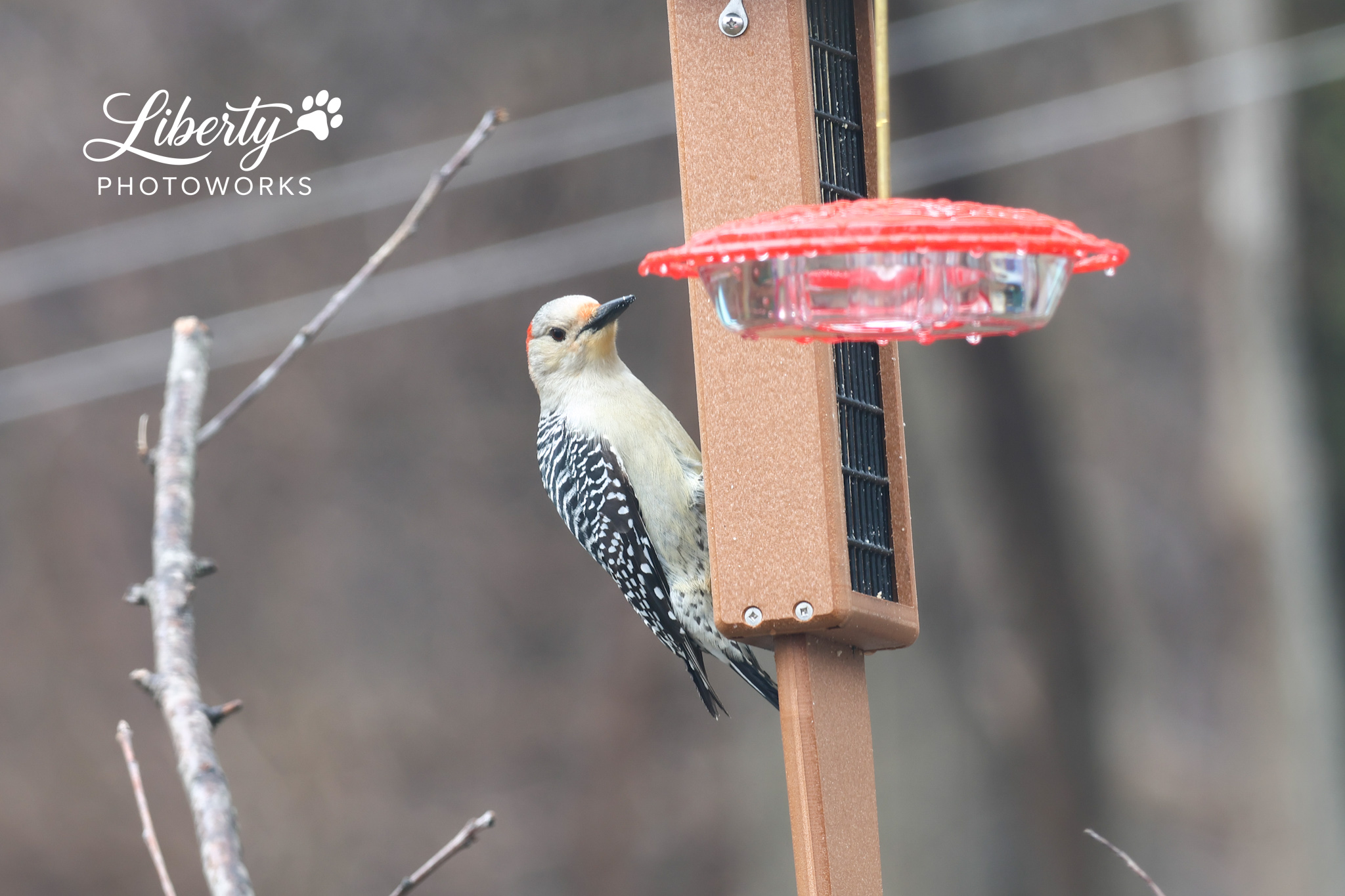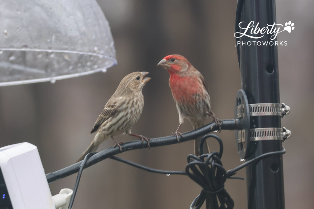 It was a rainy day and the Mockingbird was telling everyone who was boss but the lovebirds were out in full force regardless including finches feeding each other. Got a couple more shots of Mrs Red-bellied too.